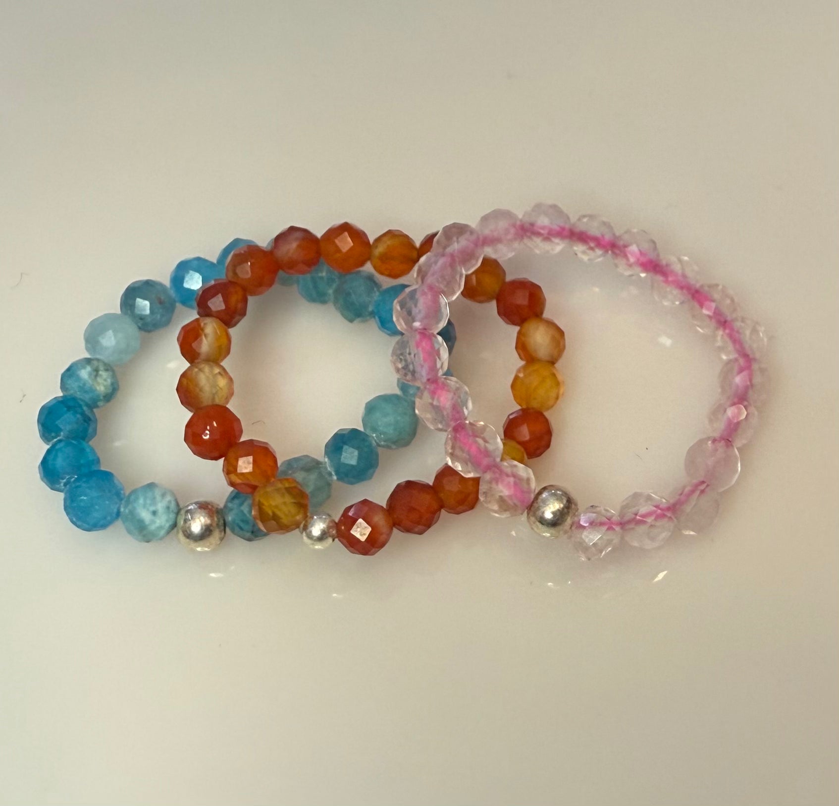 Beautiful natural crystals faceted beads ring with a sterling silver bead. Made with a durable and strong elastic cord.